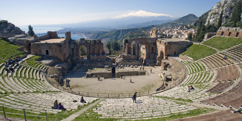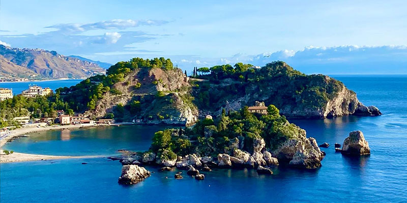 The small town of Taormina, on the East coast of Sicily facing the Ionian Sea, is located about 200 meters above sea level and has 14,000 inhabitants. Taormina is called the Pearl of the Mediterranean for several reasons: nestled on Mount Tauro, it offers the beauty of Mediterranean architecture while surrounded by endless magnificent views of both sea and mountains. Taormina has a mild climate which lends to lush vegetation year-round. Its allure and a fascination has been regaled through many illustrious writers, artists directors and travelers alike. Thanks to its high position, Taormina offers visitors a breathtaking experience. On one side you can admire the bay of Giardini Naxos and Mount Etna, the highest active volcano in Europe, while on the other side you can gaze out over the coastline toward Messina and view the proximity of the Calabrian coast. At the foot of Taormina, easily accessible by a short cable car ride, the famous bays of Mazzarò and Isola Bella with its crystalline waters. Corso Umberto is the main, pedestrian only, street at the heart of the town. Over the years, the town has always been popular to the elite tourist crowd and has welcomed many famous personalities. Many events take place in Taormina every year, particularly in summertime. The ancient Greek Theatre is an unparalleled setting for evening cultural events, such as concerts, theatre, operas, and ballets. Taormina represents the ideal base for exploring Sicily.